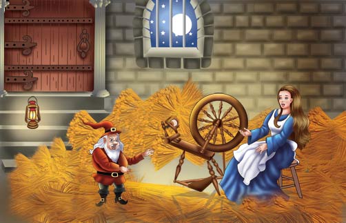 Una vez en el castillo, el rey ordenó que condujesen a la hija del molinero a una habitación repleta de paja, donde había también una rueca: “Tienes hasta el alba para demostrarme que tu padre decía la verdad y convertir esta paja en oro. De lo contrario, serás desterrada."