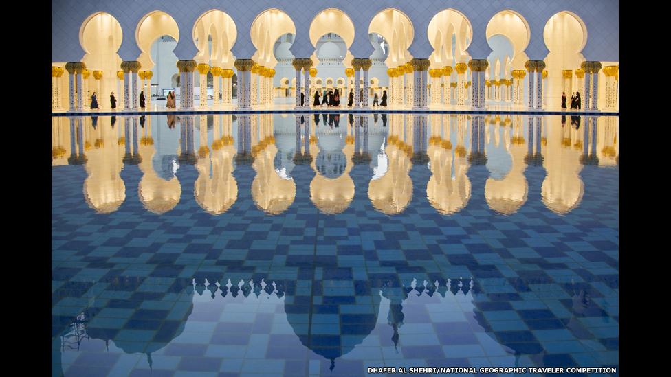 El concurso cumple 25 años y hay cuatro categorías: retratos de viaje, exteriores, lugares y momentos espontáneos. Este reflejo en la Gran Mezquita Sheikh Zayed fue tomado por Dhafer Al shehri.